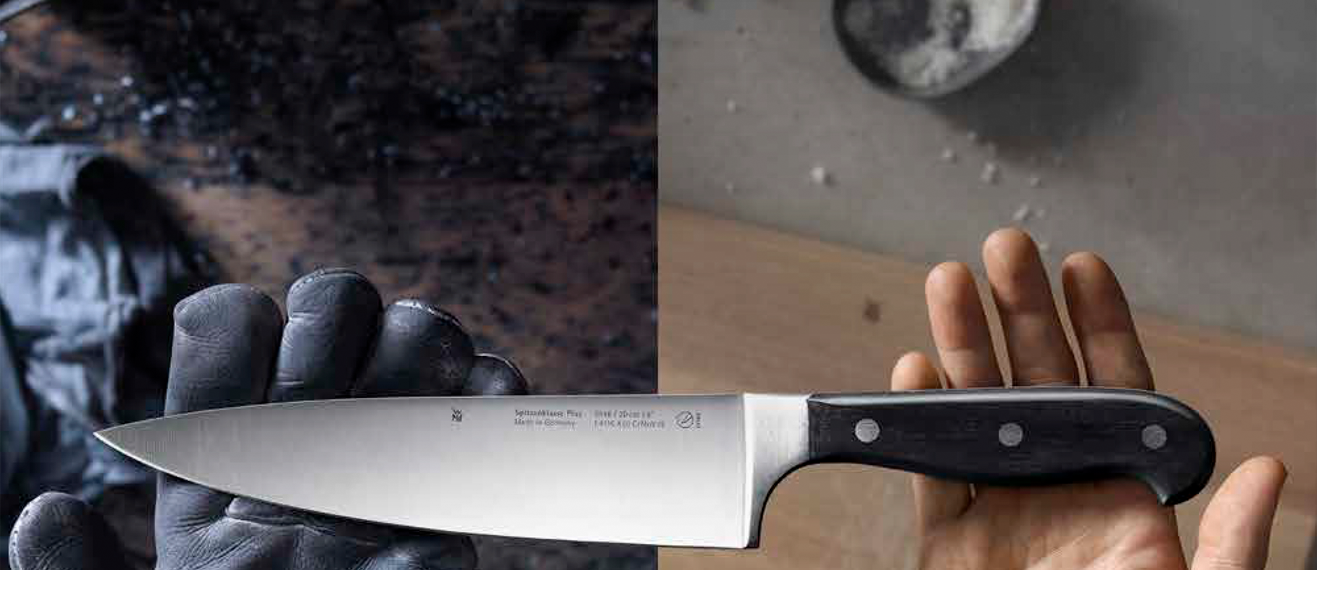 La linea WMF Grand Gourmet comprende una grande varierà di coltelli forgiati che colpiscono per il loro aspetto elegante e le eccezionali qualità di taglio. La precisa lavorazione artigianale – il collegamento impercettibile tra lama e manico – assicura che il coltello sia completamente bilanciato durante l’utilizzo.